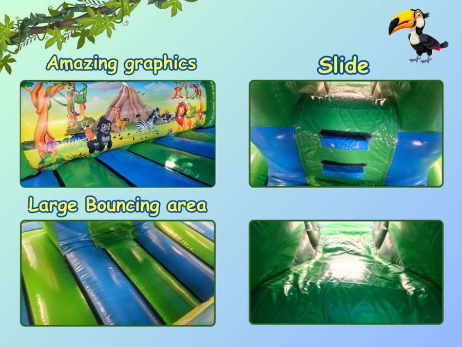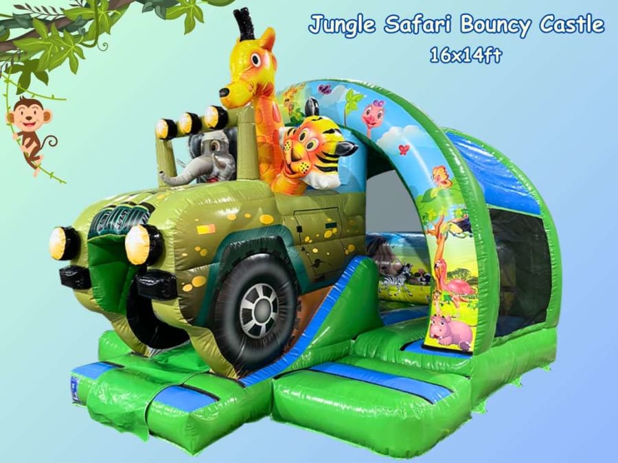This bright and spacious 16ft x 14ft inflatable boasts amazing jungle-themed graphics and an eye-catching 3D safari car with its animal occupants.