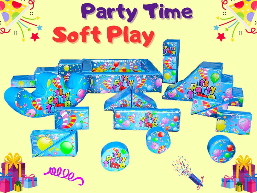 Bright and colourful Party Time theme Soft Play and Ball Pit hire. Suitable for children 1-6 years old.